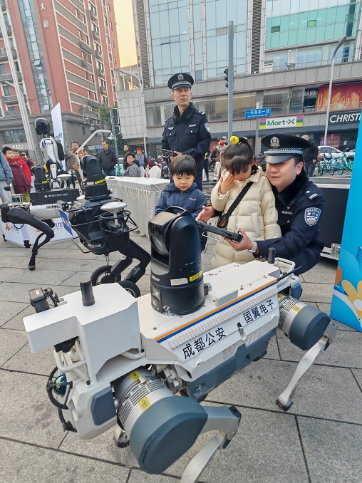 科技装备展示区成为现场焦点:警用无人机穿梭自如,机器人“通天晓”耐心解答车驾管业务咨询,智能机器狗、无人巡逻车与各类高科技单警装备一一亮相,全面展现成都公安科技兴警、智慧警务建设的创新成果。市民邹女士带着孩子驻足良久,感慨道:“太震撼了!让孩子真切体会到科技如何助力平安守护。”