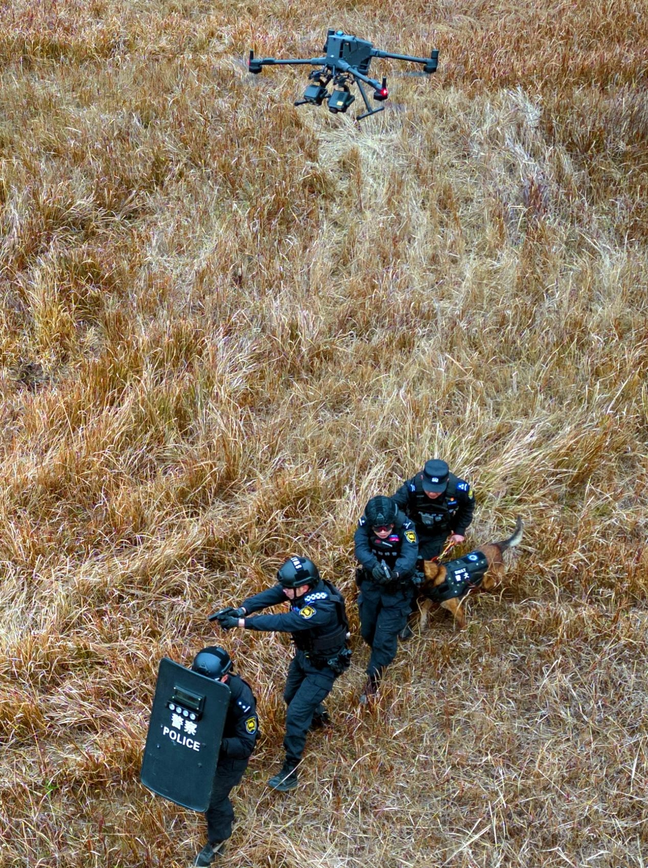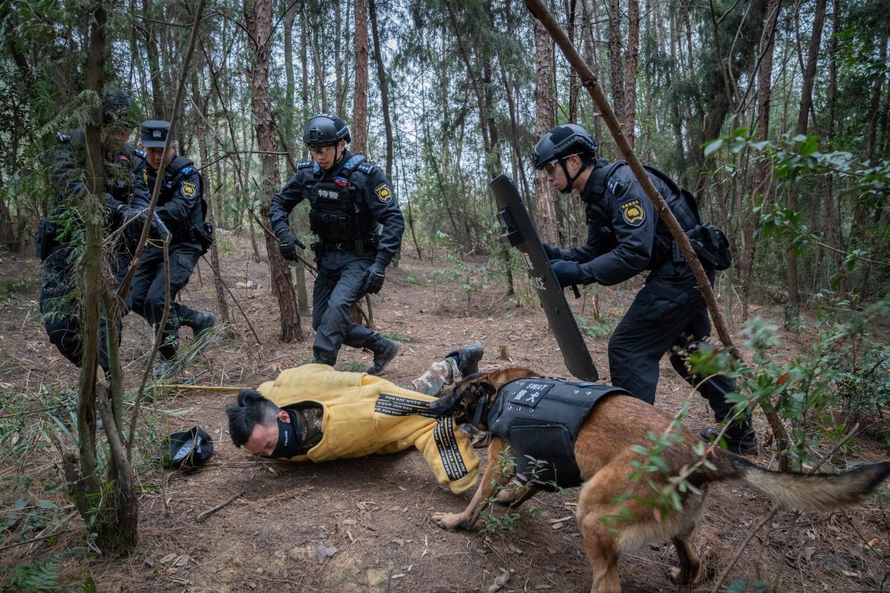无人机挂载设备升空,开展空中情报收集与警戒掩护;地面突击队员结合地形长距离奔袭,抵达目标区域后快速破门突入,为警犬搜捕扫清障碍,最终在射击环节精准命中目标,完美呈现了“空地联动、立体攻防”的作战效能。