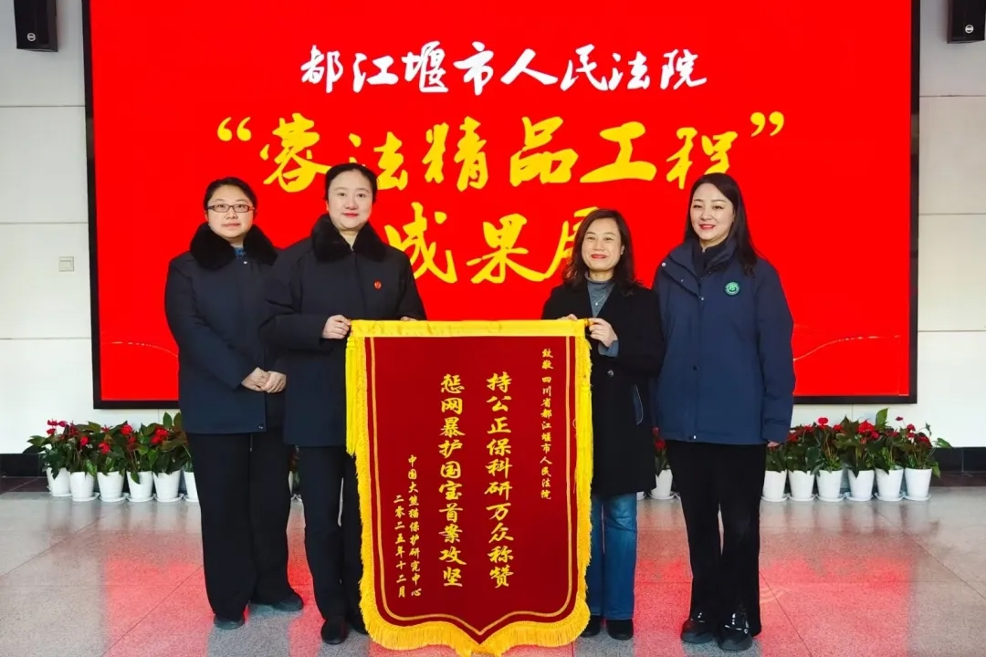 近日,中国大熊猫保护研究中心一行专程前往都江堰市人民法院,赠送“持公正保科研万众称赞 惩网暴护国宝首案攻坚”锦旗,致谢法院妥善审理全国首例“大熊猫被虐待”网络谣言案。