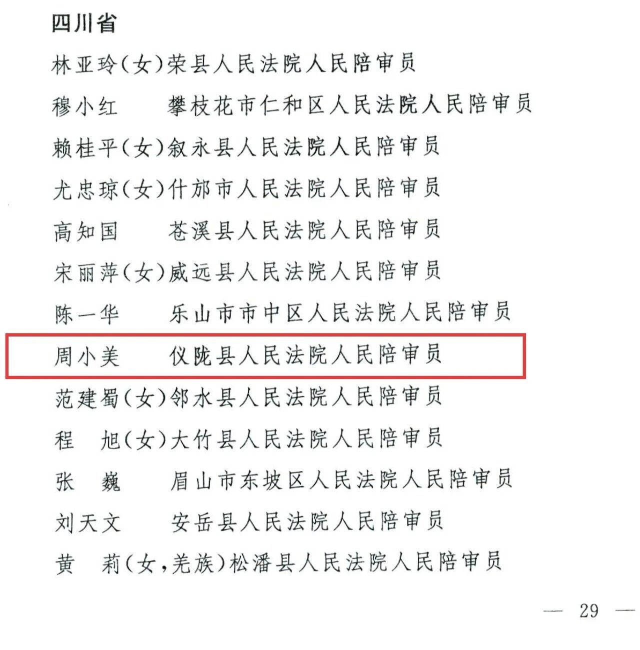 近日,最高人民法院、司法部联合召开全国人民陪审员工作会议,会上宣读了《关于对人民陪审员工作成绩突出集体和人民陪审员予以表扬的通报》,仪陇法院人民陪审员周小美获评“工作成绩突出的人民陪审员”。