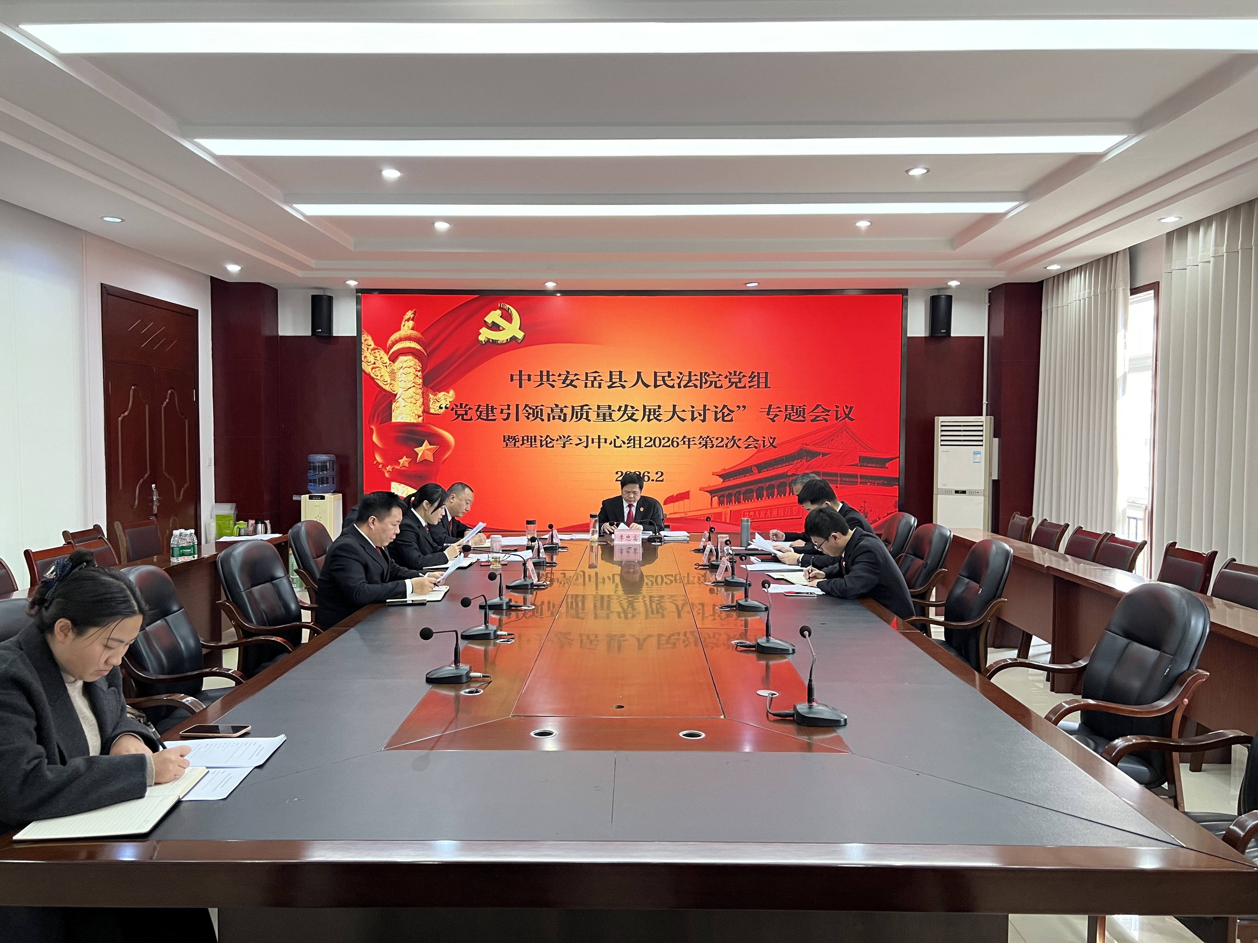 2月12日,安岳法院召开党组理论学习中心组2026年第二次专题学习会议,围绕“以高质量党建引领高质量发展”的主题开展专题学习研讨。会议由党组书记、院长李忠富主持,全体理论学习中心组成员参加会议,县委列席旁听工作指导组列席指导。