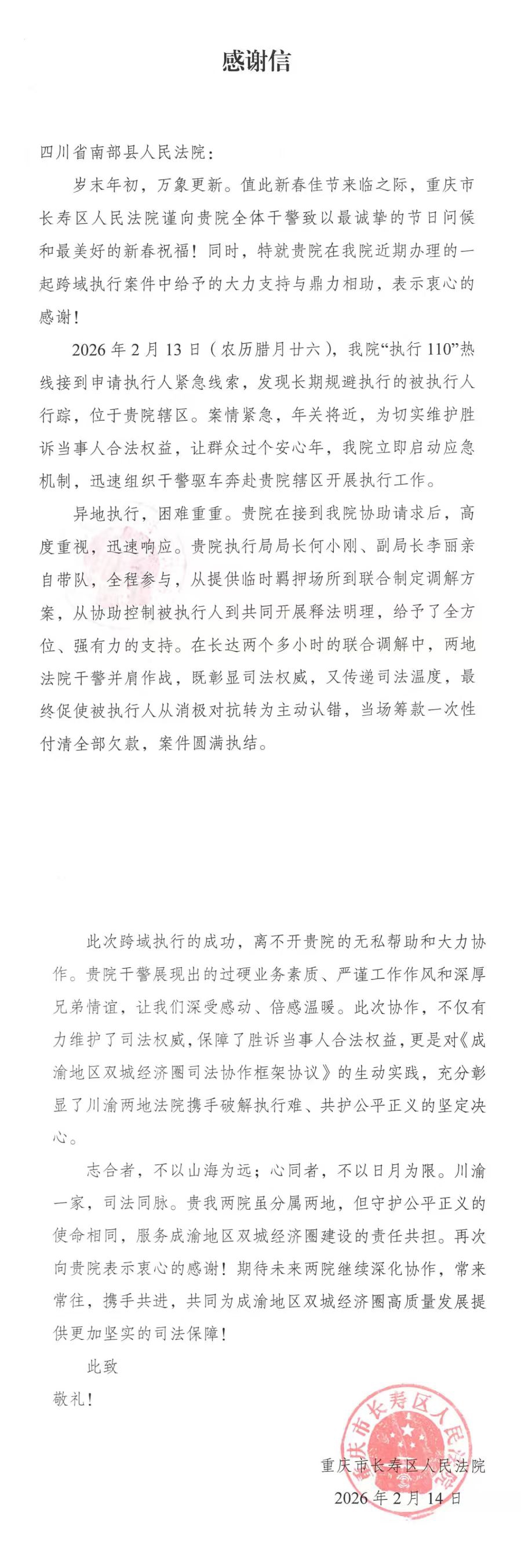 近日,南部县人民法院收到一封来自重庆市长寿区人民法院热情洋溢的感谢信。信中,重庆市长寿区人民法院对南部县人民法院在协助其办理跨域执行案件过程中,展现出的高效响应、专业协作能力给予高度评价和诚挚感谢。这封感谢信不仅是对南部县人民法院执行干警辛勤付出的肯定,更是《成渝地区双城经济圈司法协作框架协议》的生动实践,充分彰显了川渝两地法院携手破解执行难、共护公平正义的坚定决心。