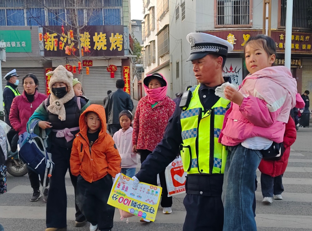 交警部门提前研判交通流量,制定“一校一策”方案,在校园周边增设临时停车区、优化信号灯配时、设置警示标志,引导接送车辆“即停即走、有序通行”。民警辅警在高峰时段现场指挥、疏导车流,护送学生安全过街,让“护学通道”真正成为安全、有序、温暖的“放心路”。