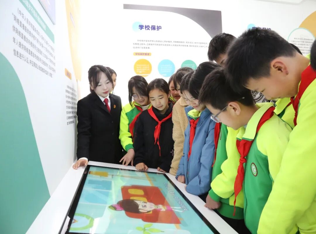 翠屏区法院金秋湖法庭依托青少年法治教育基地,邀请学生沉浸式学法。活动中,不仅组织学生参观法庭、体验穿法袍敲法槌,还围绕“五防”内容以案释法,通过普法动画、仿真模型、互动答题等形式讲解未成年人“六大保护”知识,让法治学习更生动。