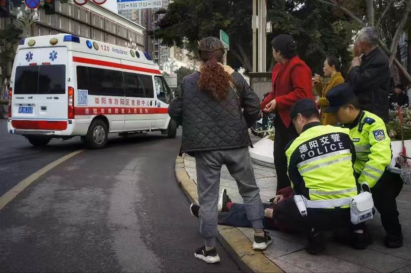 3月3日元宵节这天上午,德阳的元宵民俗游行活动火热开展,现场人流密集、秩序井然。正在德阳市区长江路与庐山路交会处的安保岗位执勤的德阳市公安局交管支队直属三大队警员刘盛成、胡志鹏,发现一名观看游行的老人突发身体不适,在路边人行道上突然晕倒,面色苍白、状态不佳,情况紧急。发现险情后,两人第一时间快速跑到老人身边,迅速启动应急处置。
