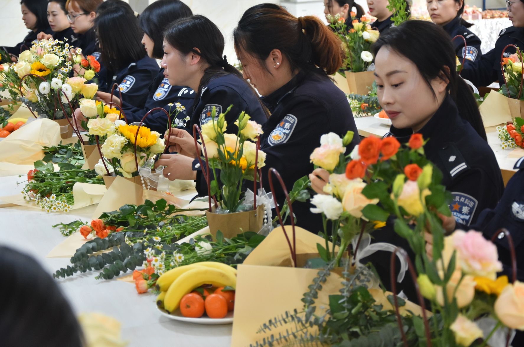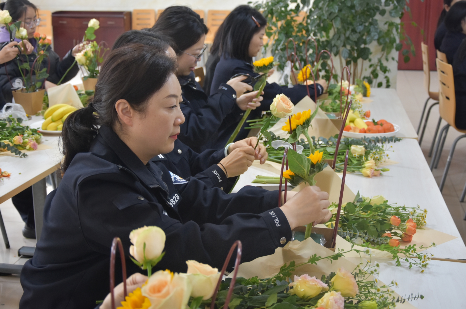 大家相互交流插花心得,欣赏彼此的作品,享受着花艺创作带来的宁静与愉悦,现场气氛热烈而融洽。一篮篮生机盎然的作品,不仅装点了节日,更展现了分局女警热爱生活、积极向上的精神风貌。