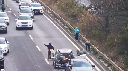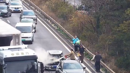 危急时刻,一辆轿车停靠在应急车道,自贡监狱民警李再波途经此处发现火情后立即下车,迅速带上灭火器冲向着火车辆。