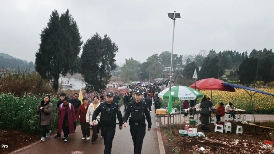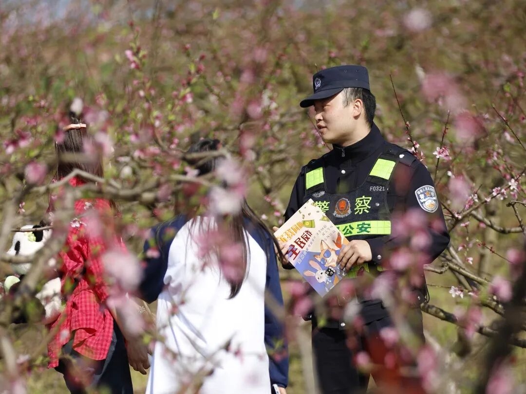 阳春三月,遂宁安居区万亩桃林染红山野,五彩油菜花海随风翻浪,一幅幅生机盎然的春日画卷徐徐展开。游客纷至沓来,在花海中拍照打卡,定格美好瞬间。而在这一派祥和春色里,一抹抹“藏蓝”身影穿梭其间,用守护为美景铺就平安底色。