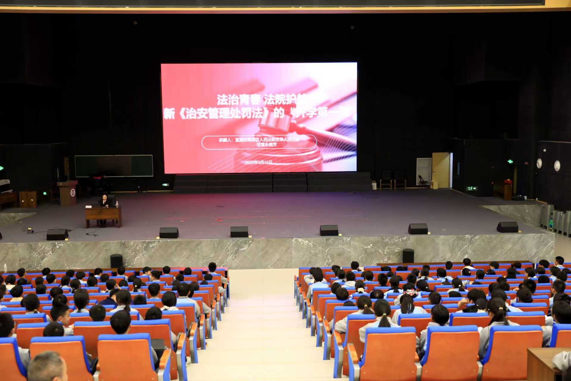 3月11日,宜宾市翠屏区法院人民法院安阜法庭走进宜宾市第四中学校,围绕2026年1月1日起施行的新修订《中华人民共和国治安管理处罚法》,通过法条解读、以案释法、情景互动等方式,为该校700余名初二年级学生送上新学期“开学第一课”专题法治讲座。