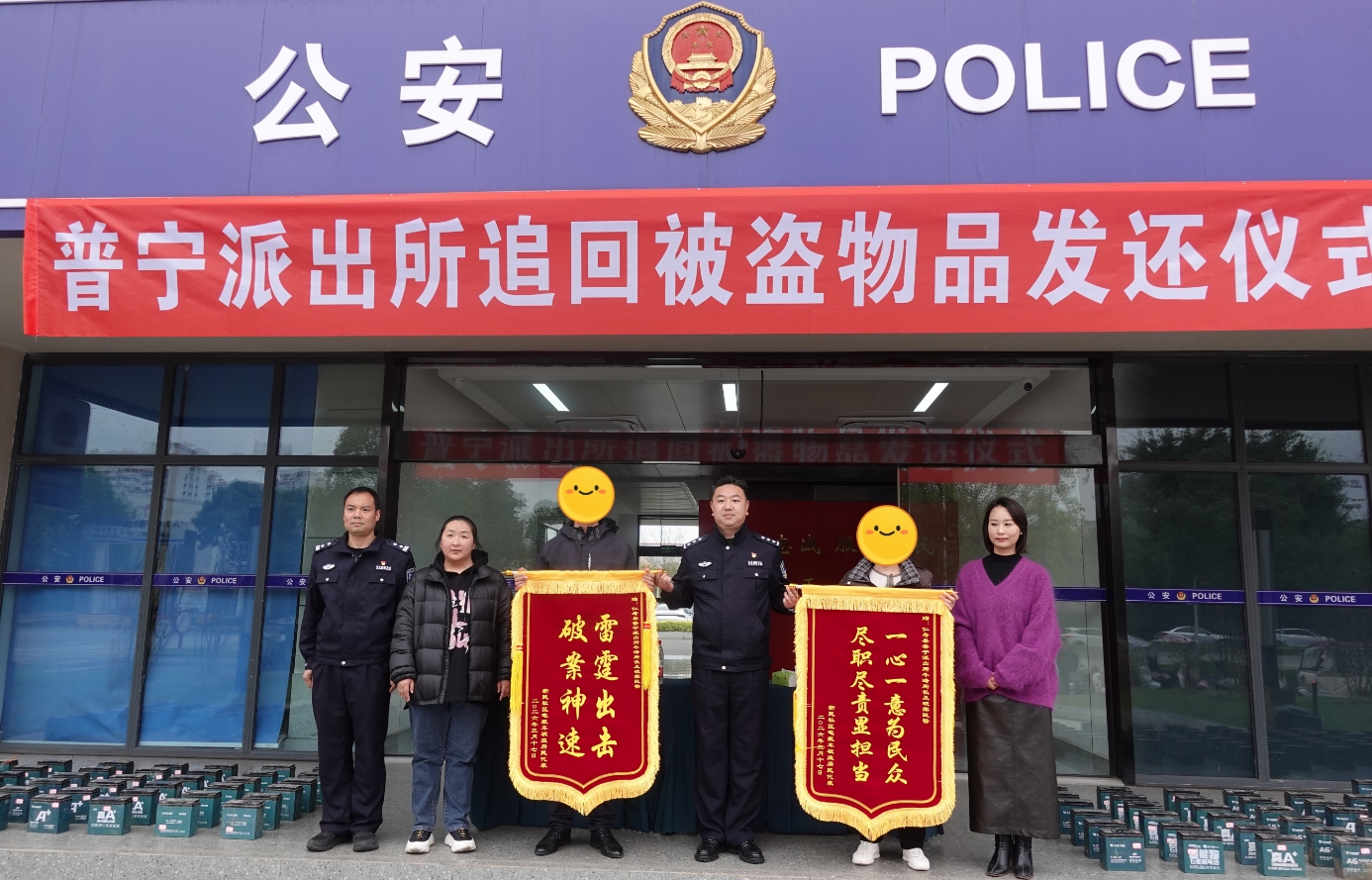 3月17日上午,仁寿县公安局普宁派出所举行被盗物品集中发还仪式,将近期破获盗窃案件中成功追回的 280 余个电瓶车电瓶,悉数发还给受害群众。