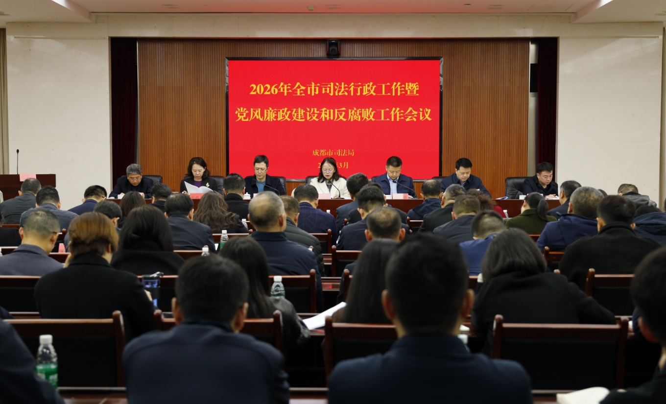 会议强调,2026年是“十五五”规划的开局之年。全市司法行政系统要牢牢坚持党的绝对领导,以党的政治建设为统领,深入学习践行习近平法治思想,筑牢纪律刚性防线,强化依法治市统筹协调,切实担负起推进法治建设的政治责任;要统筹推动政府立法,加强重点领域立法供给,提升合法性审查质效,细化立法后评估工作,护航经济社会发展;要推进法治政府建设,精准回应企业法律服务需求,加强行政执法监督,强化行政复议工作,激发市场主体活力;要优化法律服务供给,深化成渝法治协作,提升涉外法律服务能级,健全现代公共法律服务体系,回应人民群众期盼;要防范化解风险隐患,完善矛盾纠纷多元化解机制,加强社区矫正和安置帮教工作,夯实基层法治建设基础,服务保障平安成都。要深化干部队伍建设,鲜明用人导向,提升专业素养,深化作风建设,锻造过硬司法行政队伍。