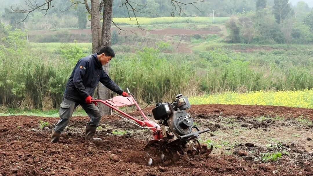 ▲村民使用旋耕机翻土