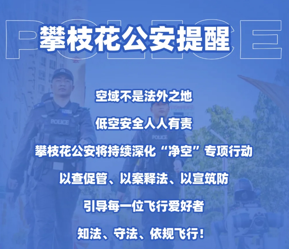 东区公安表示,空域安全关乎公共安全,低空防线需要全民共守。下一步,分局将持续深化“净空”专项行动,坚持以查促管、以案释法、以宣筑防,加大查处与宣传力度,严厉打击各类无人机违法违规飞行。同时提醒广大无人机爱好者,自觉遵守空域管理法律法规,摒弃侥幸心理,做到知法、守法、依规飞行,共同守护攀枝花东区低空安全。