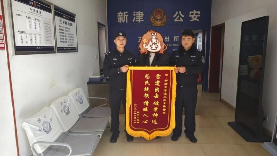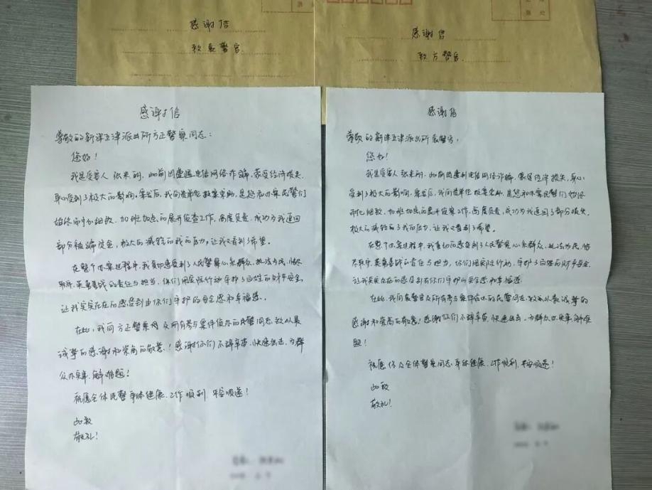 近日,张女士专程来到成都市公安局新津区分局五津派出所,将一面印有“雷霆出击破案神速,为民挽损情暖人心”的锦旗和两封感谢信,交到办案民警袁鑫龙、方正手中,衷心感谢民警尽心竭力为其追回被骗资金5万余元。
