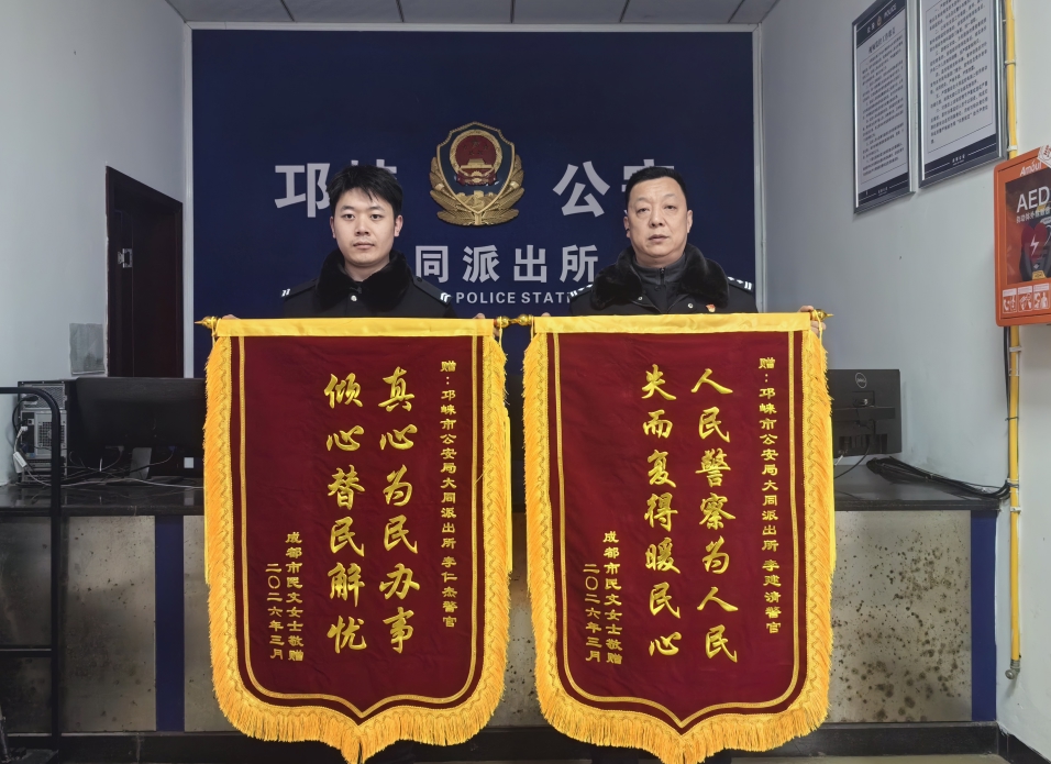 近日,邛崃市公安局大同派出所收到一个来自外地的特殊快递,民警打开后发现是绣着“人民警察为人民 失而复得暖民心”“真心为民办事 倾心替民解忧”的两面锦旗。
