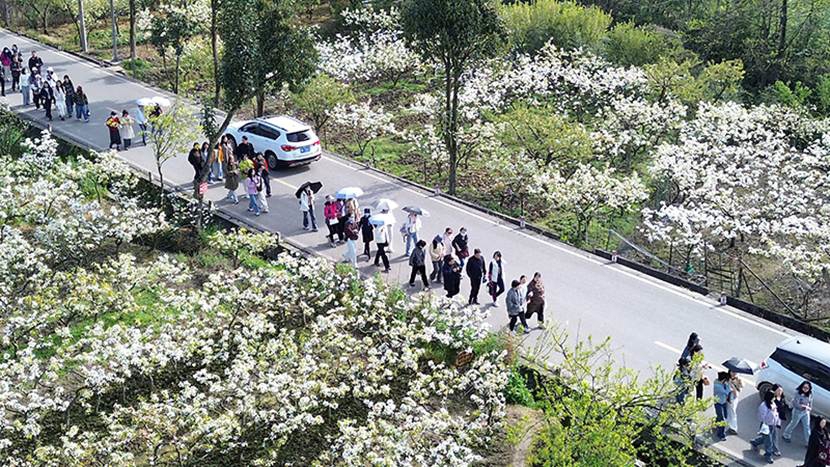 三月的棚花村已然成了花的海洋。连片梨花进入盛花期,素白花瓣覆满枝头,如积雪凝霜,似流云漫坡,顺着山势连绵铺展,与远山青黛、村落民居相映成趣。种植基地里,五颜六色的油菜花芬香扑鼻、随风摇曳,分外娇艳。