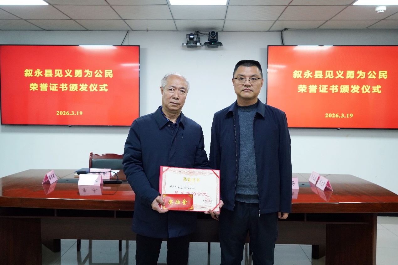 近日,叙永县委政法委举行表彰仪式,为薛彦林等7名荣获“叙永县见义勇为公民”称号的先进个人颁发荣誉证书和奖励金,表扬他们挺身而出、见义勇为的英雄壮举,弘扬社会正气,凝聚平安建设合力。