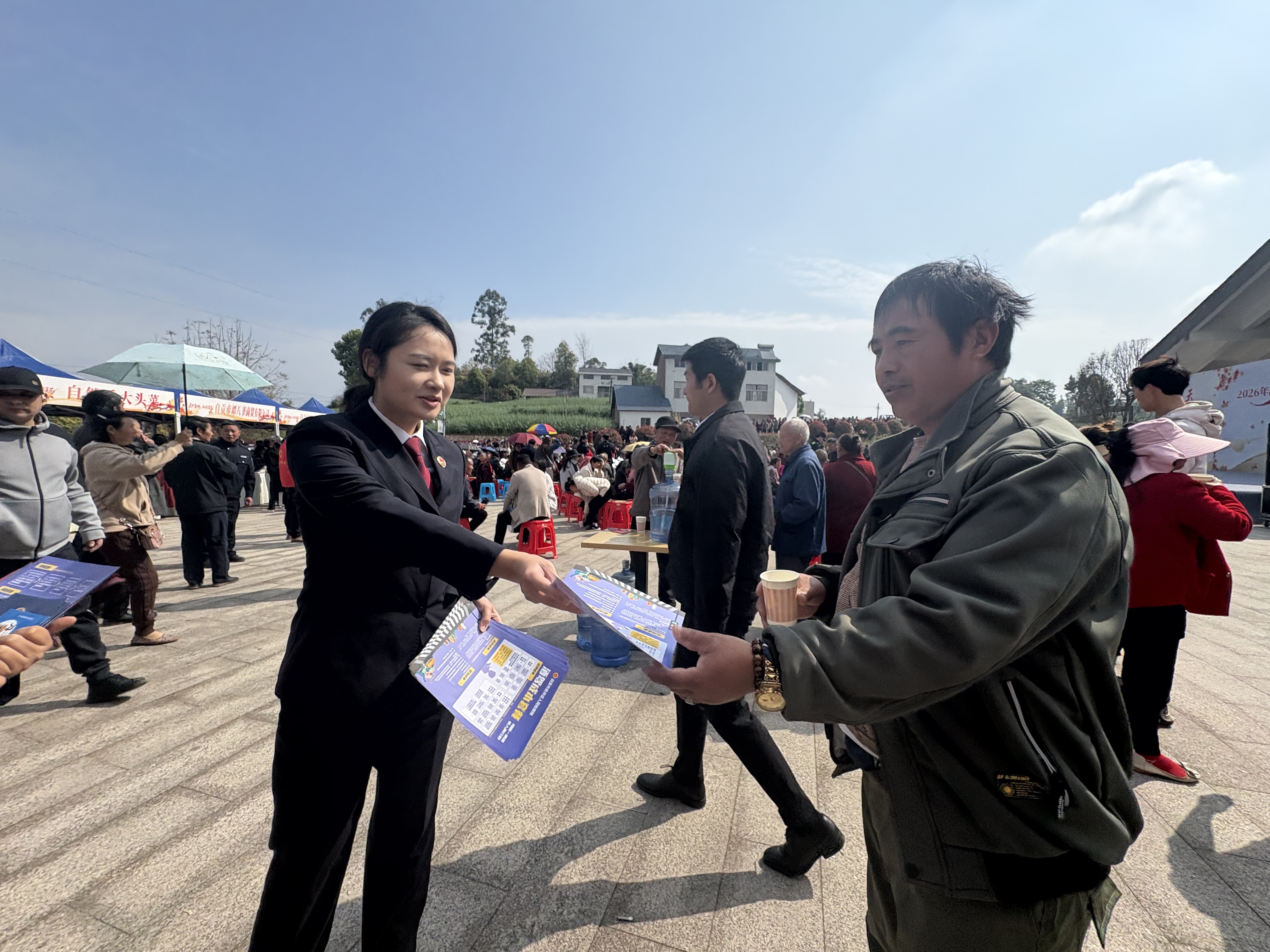 作为护航莲花镇文旅发展的“老朋友”,贡井区检察院延续去年“司法同行”工作理念,在景区主会场设立宣传点,依托公益诉讼检察、民事检察职能,持续聚焦生态环境保护、食品安全等与文旅发展、群众生活密切相关的领域。检察官通过发放宣传手册、现场互动答疑等方式,向过往游客、周边村民普及《中华人民共和国民法典》《中华人民共和国消费者权益保护法》及公益诉讼相关法律法规,重点解读景区生态保护、旅游消费维权等法律知识,现场解答法律咨询百余次,引导群众以法治思维守护莲花镇的绿水青山,依法维护自身合法权益。