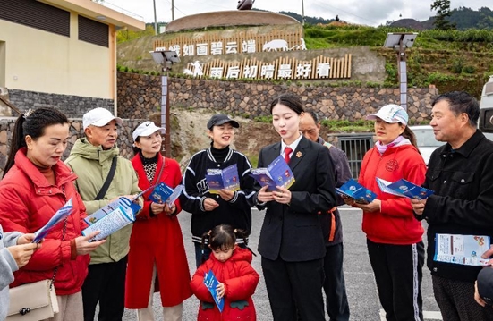 “欢迎大家来到四峨山千年古梯田,我们为大家准备了法治小锦囊,助力大家安心游玩、放心消费。”在景区内,法院干警向游客发放普法资料、现场答疑解惑,细致讲解旅游消费维权要点,得到游客一致认可。