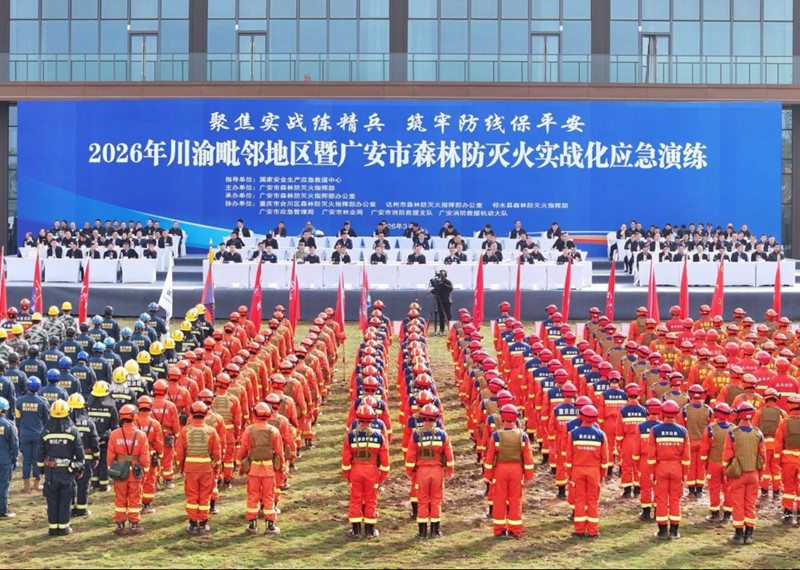 3月26日上午,2026年川渝毗邻地区暨广安市森林防灭火实战化应急演练在四川省广安市邻水县举行。此次演练是广安市首次与川渝毗邻地区举行森林防灭火大规模实战化联合应急演练,旨在检验对广安应对处置跨区域森林火灾机制和能力,提升川渝毗邻地区防范和抵御重大风险的能力和水平。