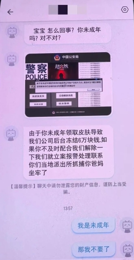 骗子通常先在短视频、游戏平台发布“免费皮肤”“游戏道具”等诱饵,诱导未成年人添加好友;随后以“账户冻结”“涉嫌违法”“要抓家长”等话术进行威胁恐吓,逼迫孩子在恐慌中偷偷操作手机转账,从而实施诈骗。