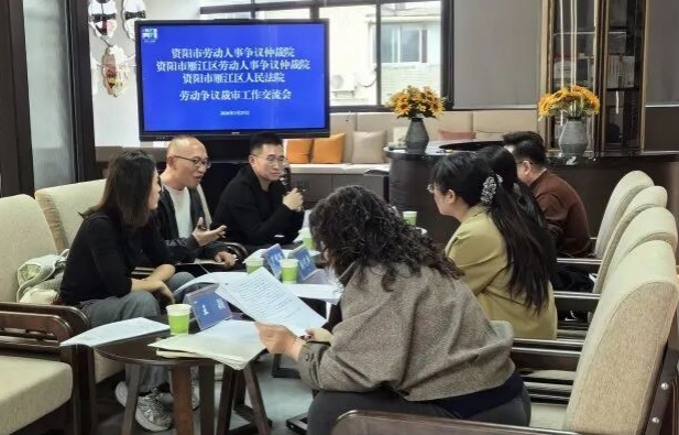近日,资阳市雁江区人民法院为进一步健全劳动人事争议裁审衔接机制,统一法律适用标准,提升矛盾纠纷化解质效,营造和谐稳定的劳动关系,该院民事审判第三庭联合市、区劳动人事争议仲裁院共同开展业务交流座谈会。双方围绕裁审实务分歧、提升调解成功率、深化多元解纷等核心议题深入研讨。