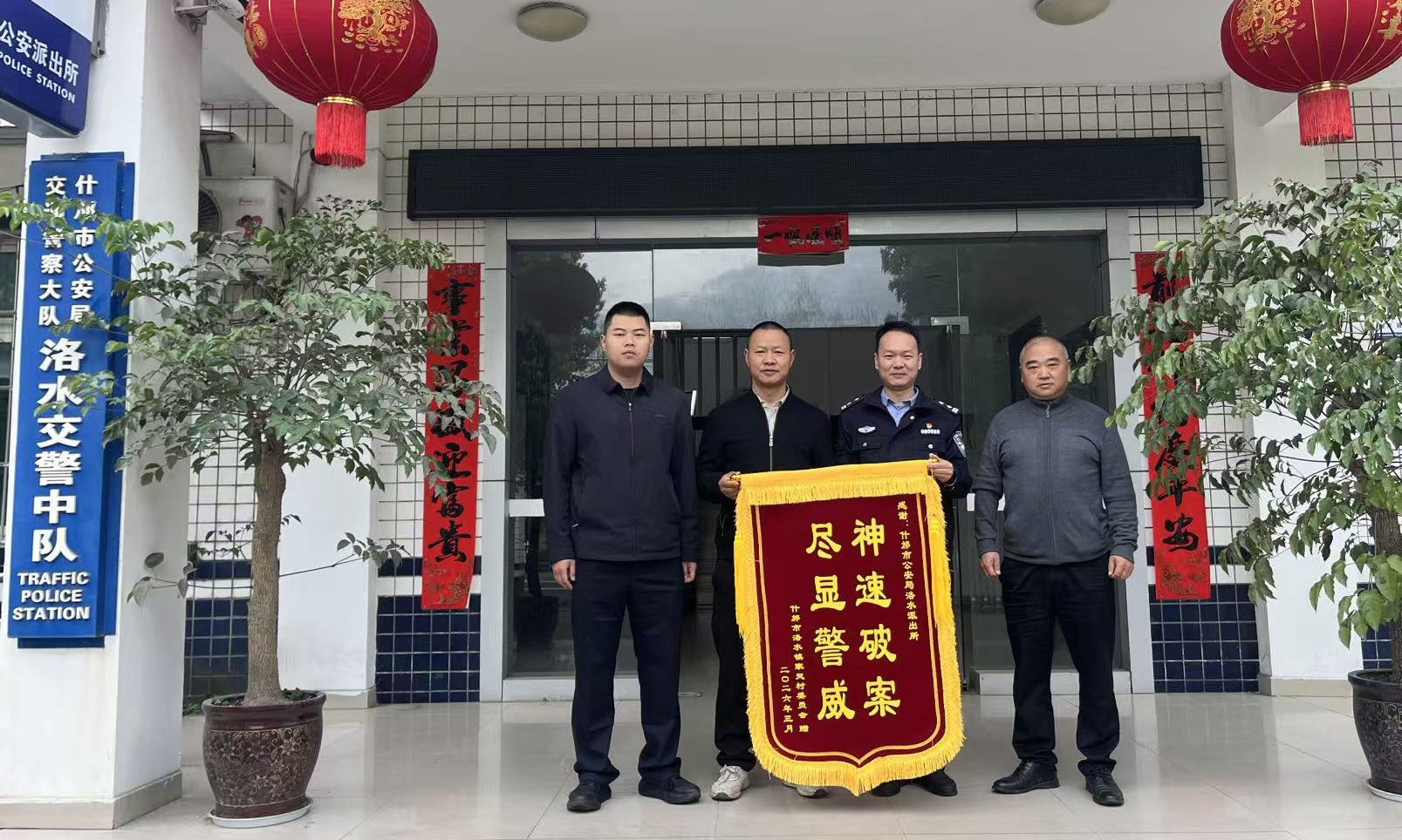 3月31日,什邡市洛水镇家灵村村干部代表全村村民,向什邡市公安局洛水派出所送上一面印有“神速破案 尽显警威”的锦旗,对警方逮住“田埂硕鼠”表示诚挚谢意。
