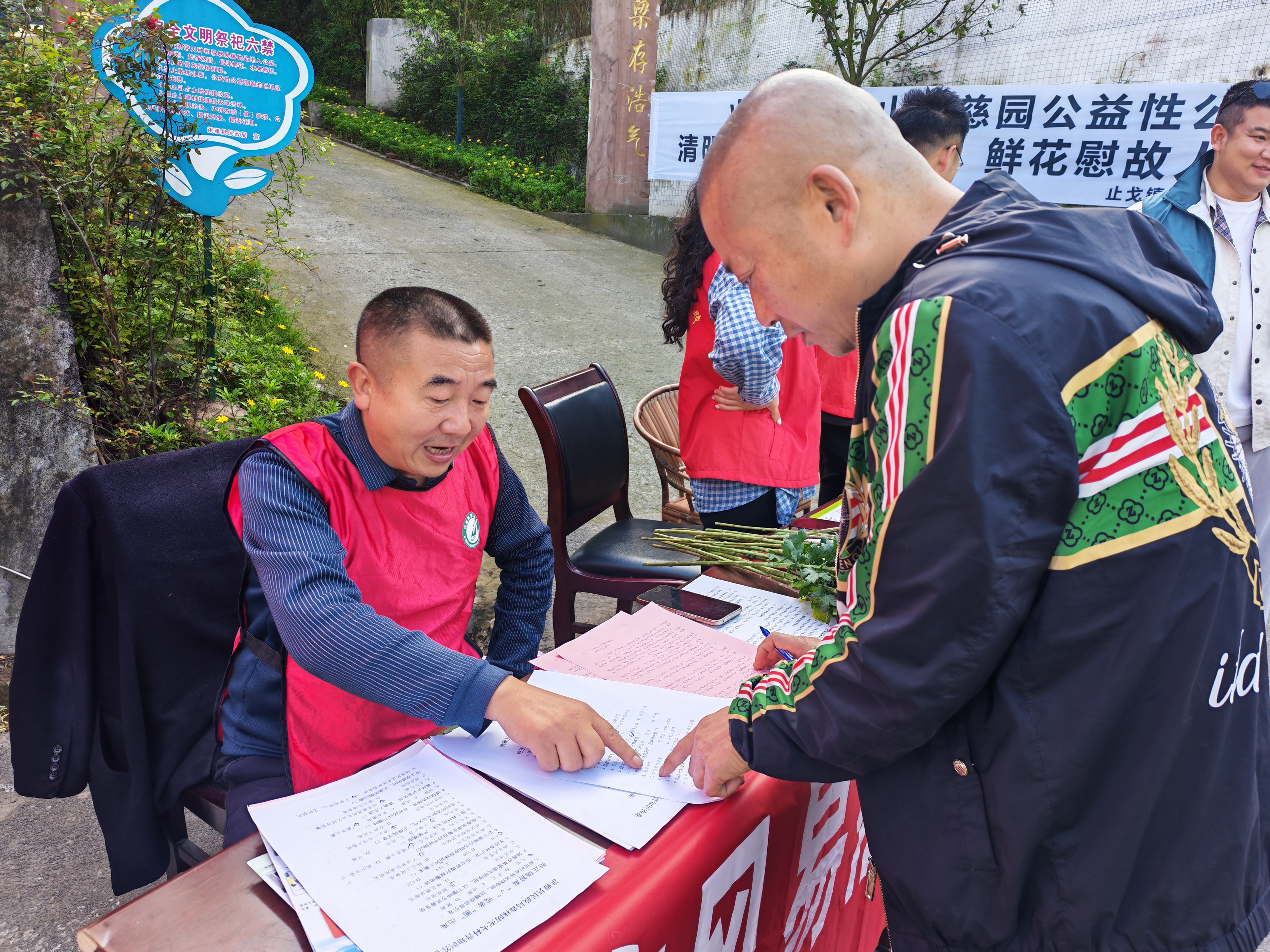 与生态集中安葬相呼应,在该县止戈镇花果山孝慈园公益性公墓陵园,县民政局与止戈镇联合开展“鲜花换纸钱”活动,以“柔性引导”替代“硬性约束”,让文明祭扫理念走进群众心中。在入口处设立的“文明祭祀鲜花置换点”前,志愿者向群众赠送鲜花并讲解鲜花祭祀的环保意义,发放《文明祭扫倡议书》,引导群众以敬献鲜花等低碳方式寄托哀思,同时宣传森林防火知识,筑牢清明祭扫安全防线。