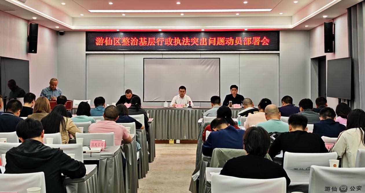 4月9日下午,绵阳市游仙区召开全区整治基层行政执法突出问题动员部署会,区政府副区长、区公安分局局长吴勇出席会议并作讲话。区级相关部门、经济试验区及各镇(街道)分管行政执法工作的领导50余人参加会议。会议由区委依法治区办副主任,区司法局党组书记、局长唐容云主持。
