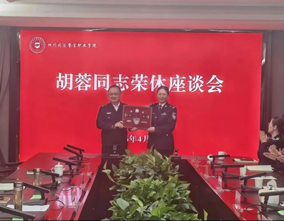 近日,四川司法警官职业学院为二级巡视员胡蓉举办荣休座谈会。学院党委书记田亮,学院党委副书记、院长张大立等领导班子成员,四系、政治部、办公室、继教部、招就处、计财处、工会负责人及相关同志参加座谈。