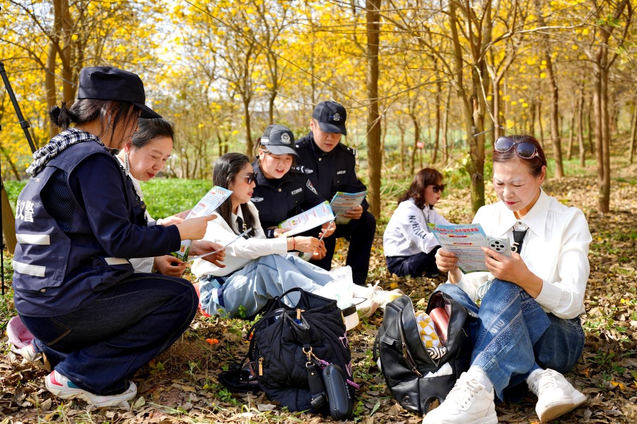4月3日,石碾镇风铃园景区内,黄花风铃木盛放如金,踏青赏花的群众络绎不绝。隆昌市公安局联合生态义警深入林区景区,“面对面”向游客进行踏青野炊、清明祭扫、春耕用火等风险提醒,普及野外用火禁令、火灾报警常识,警民携手守护绿水青山。