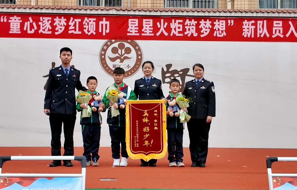 为表彰孩子们拾金不昧的优秀品质,4月14日,资溪派出所西门桥警务站民警专程前往雁江二小,在学校2026年少先队入队仪式现场登台宣读表扬信。仪式上,四年级老队员为一年级新队员佩戴红领巾,身为四年级学生的李修杰双手托起红领巾,仔细为学弟整理衣领、系好领结,动作认真而庄重。