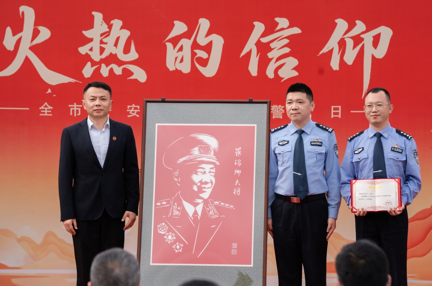 活动中,主题宣传片《火热的信仰》生动展现了长征精神与新时代公安使命的深度融合;顺庆分局《读懂罗瑞卿》、蓬安县局《抗大的过去与现在》等诵读节目,带领大家重温革命岁月、感悟忠诚担当;西充县局《如愿》、南部县局《一封家书》、营山县局古筝独奏《华夏》等节目以文艺形式传递信仰力量,引发全场共鸣。仪陇、高坪、市局机关等单位依次登台,通过故事分享、诗朗诵、舞蹈等形式,展现了青年民辅警赓续红色血脉、勇担时代重任的青春风采。嘉陵分局带来的非遗表演《剪映初心》成为一大亮点。非遗剪纸传承人杜华江警官,以传统阴刻技艺精心制作《罗瑞卿大将肖像剪纸》,捐赠给罗瑞卿纪念馆。