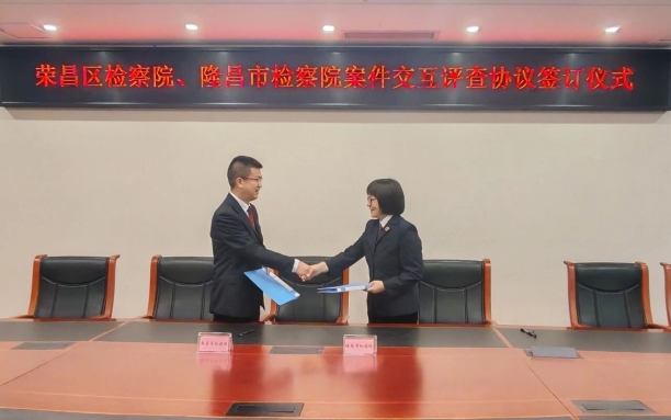 4月21日,隆昌市检察院与重庆市荣昌区检察院会签《关于常态化落实荣隆两地政法系统案件交互评查协议暨共同推动川渝毗邻地区检察机关案件质量管理工作办法(试行)》(以下简称《办法》)。荣昌区检察院检委会专职委员肖成伟,隆昌市检察院党组成员、副检察长唐晶晶出席签约仪式。
