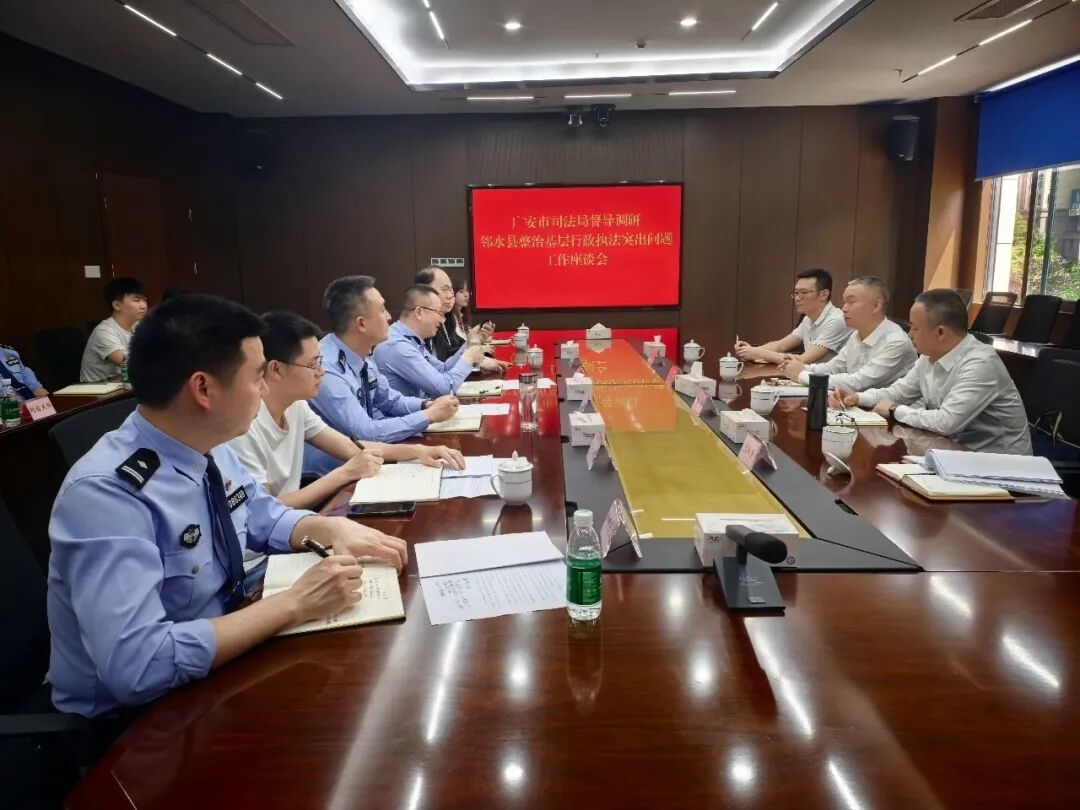 4月24日,广安市司法局党组书记、局长李廷远带队下沉邻水县调研督导基层行政执法突出问题整治工作,邻水县副县长、县公安局局长杨军陪同调研。