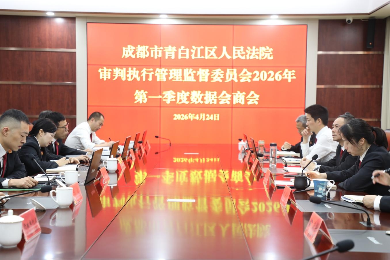 4月24日,成都市青白江区法院召开2026年第一季度司法办案监管数据会商,传达贯彻全市法院审判执行管理监督委员会2026年第一季度重点数据会商会会议精神,分析研判第一季度执法办案态势,研究部署下一步工作打算。区法院党组书记、院长王湛出席会议并讲话,全体在家院领导、各审执业务部门负责人参加会议。