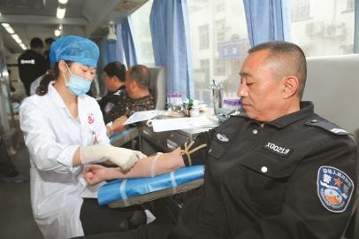 为缓解临床医疗用血告急状况,近日,南充市公安局顺庆区分局荆溪派出所联合南充市中心血站,组织民警开展集中献血活动。全体民警和辅警依次登上停在派出所门口的流动采血车,踊跃献血5000毫升。据悉,这是该派出所连续3年来第3次组织民警开展集中献血活动。图为民警正在献血。