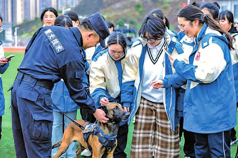 (达州公安开展警营开放日活动,同学们接触警犬 四川法治报全媒体记者 张磊 摄)