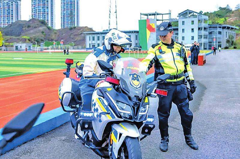 (警营开放日活动中,一名同学“试驾”警用摩托 四川法治报全媒体记者 张磊 摄)