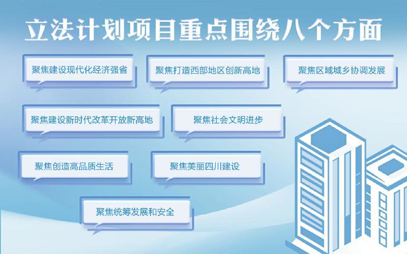 记者了解到,此次立法计划项目重点围绕八个方面展开,具体包括聚焦建设现代化经济强省,起草并提请省人大常委会审议四川省民营经济促进条例草案、四川省消费者权益保护条例(修订)草案、四川省道路运输条例(修订)草案等;聚焦打造西部地区创新高地,起草并提请省人大常委会审议四川省技术市场条例(修正)草案,加快推进四川省人工智能产业发展促进条例、四川省科学技术普及条例(修订)调研论证等;聚焦区域城乡协调发展,起草并提请省人大常委会审议四川省农村集体经济组织条例(修正)草案,加快推进四川省革命老区振兴发展促进条例调研论证等;聚焦建设新时代改革开放新高地,加快推进四川省发展规划条例、四川省人民政府关于中国(四川)自由贸易试验区实施省级管理事项的决定调研论证等;聚焦社会文明进步,起草并提请省人大常委会审议四川省历史文化名城名镇名村保护条例草案等;聚焦创造高品质生活,加快推进四川省城市更新条例、四川省失业保险条例(修订)、四川省城市供水条例(修订)调研论证等;聚焦美丽四川建设,加快推进四川省森林草原防灭火条例、四川省矿产资源管理条例(修订)调研论证等;聚焦统筹发展和安全,起草并提请省人大常委会审议四川省网络安全条例草案,加快推进四川省《中华人民共和国反电信网络诈骗法》实施办法、四川省110接处警工作规定、四川省气象灾害防御重点单位管理办法调研论证等。