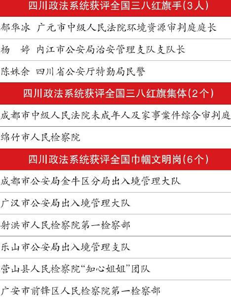 四川法治报全媒体记者 王晗阳 “三八”国际妇女节将至,全国妇联3月2日在京举行纪念“三八”国际妇女节暨表彰大会。大会表彰了9名全国三八红旗手标兵、598名全国三八红旗手、400个全国三八红旗集体、600个全国巾帼文明岗。四川政法系统有3名个人、2个集体、6个单位获得表彰。