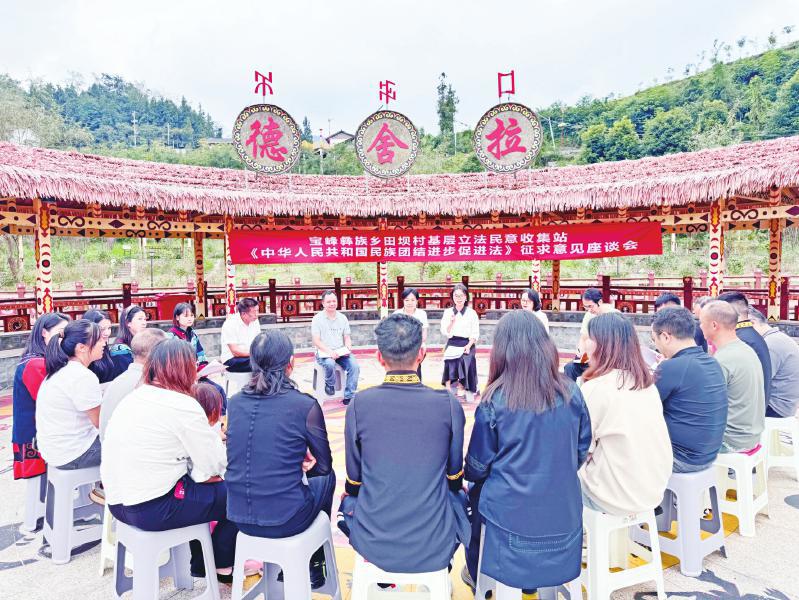 时间回到2025年10月。那天,“德舍拉”广场上格外热闹。一场针对民族团结进步促进法(草案)的意见征集会正在举行。乡人大代表、村干部、彝族群众等20余人围坐在一起畅所欲言。