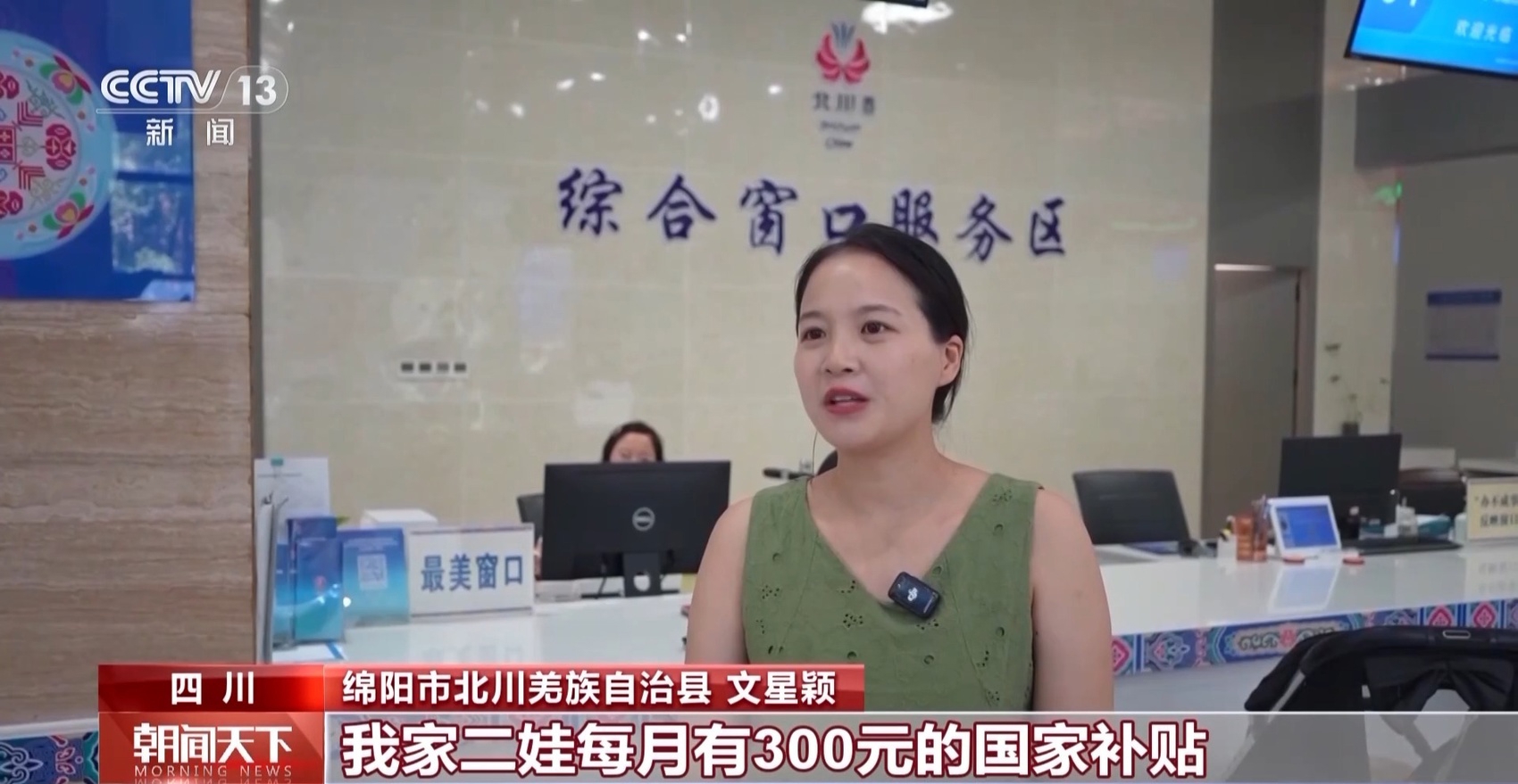 在四川省绵阳市北川羌族自治县,记者看到市民文女士抱着二胎宝宝前来了解育儿补贴新政。