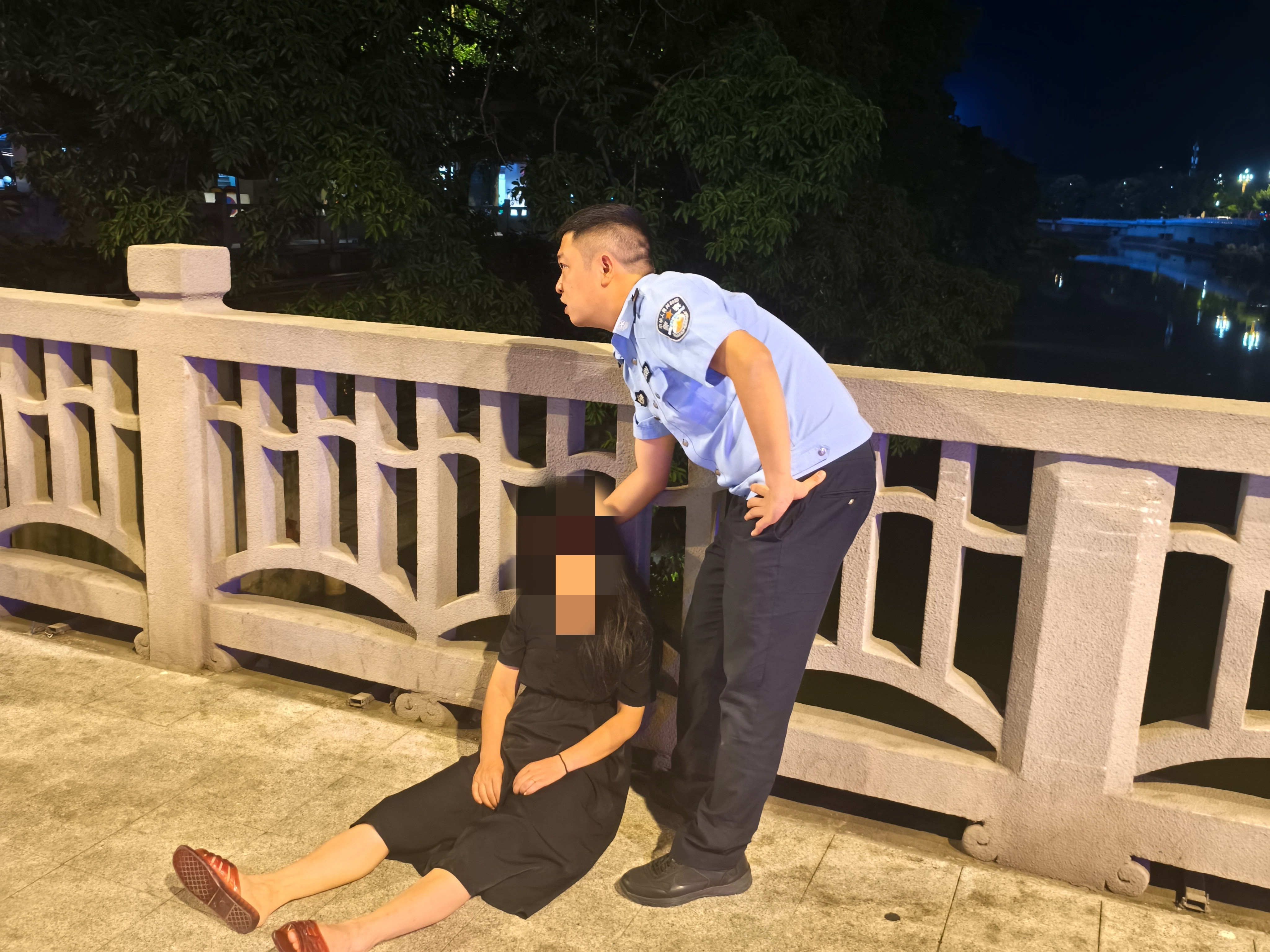 9月1日晚上十点,荣县公安局旭阳派出所“00后”民警张恩浩和贺黎阳,在荣县老城区开展治安巡逻时,驾车通过南门桥,发现对向车道桥护栏边站一名身穿黑衣的女子,双手扶着桥栏杆,一只脚一直试图翻越桥护栏。