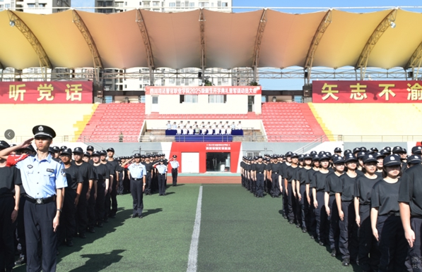 金秋时节,硕果盈枝,在承载着收获与希冀的时节,四川司法警官职业学院迎来了2700余名新生学子。9月8日,学院在凯江校区北校区操场召开2025级新生开学典礼暨军训动员大会,全体院领导、学院二级巡视员、德阳市旌阳区人武部上校部长杨斌出席典礼,四系两部及相关处室负责人、德阳市旌阳区人武部代表同志、各学生中队中队长、辅导员及全体2025级新生参加典礼。学院党委书记田亮主持典礼并讲话。