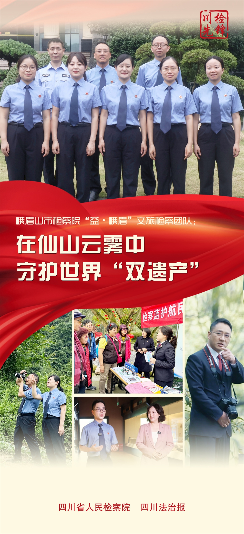 2021年,峨眉山市检察院组建起一支特殊战队——“益·峨眉”文旅检察办案团队。由该院副检察长牵头,汇聚公益诉讼骨干、刑事办案“老兵”、行政检察能手,甚至从法院民事审判庭引进“新兵”,再配上懂技术的无人机飞手……他们像一支“司法特种部队”,从个案切入,以“四大检察”融合履职,守护着峨眉山的万物生灵、历史古迹与游人安全。