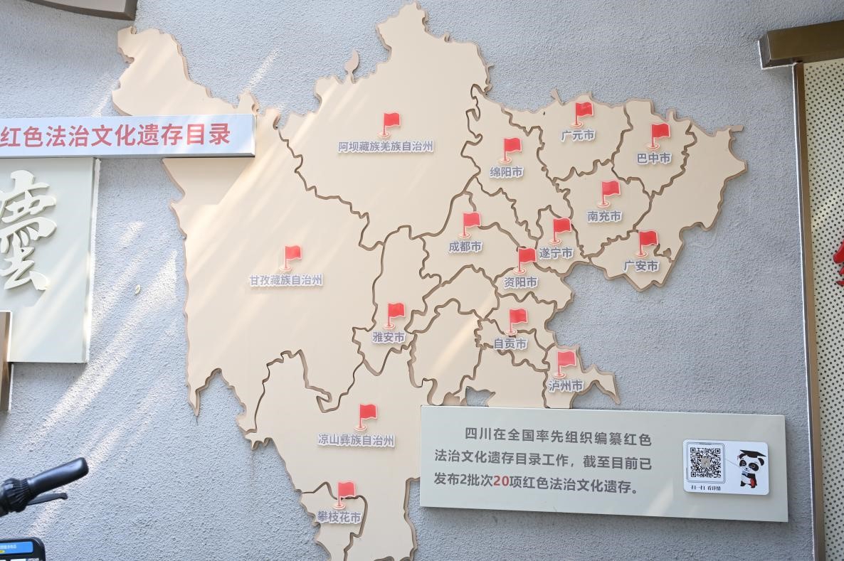 走到四川省司法厅外,视线很快被一幅醒目的地图吸引。定睛看去,这幅地图上一个个小红旗标注出四川已公布的红色法治文化遗存所在地,悄然诉说着四川红色法治文化的深厚底蕴与历史脉络。