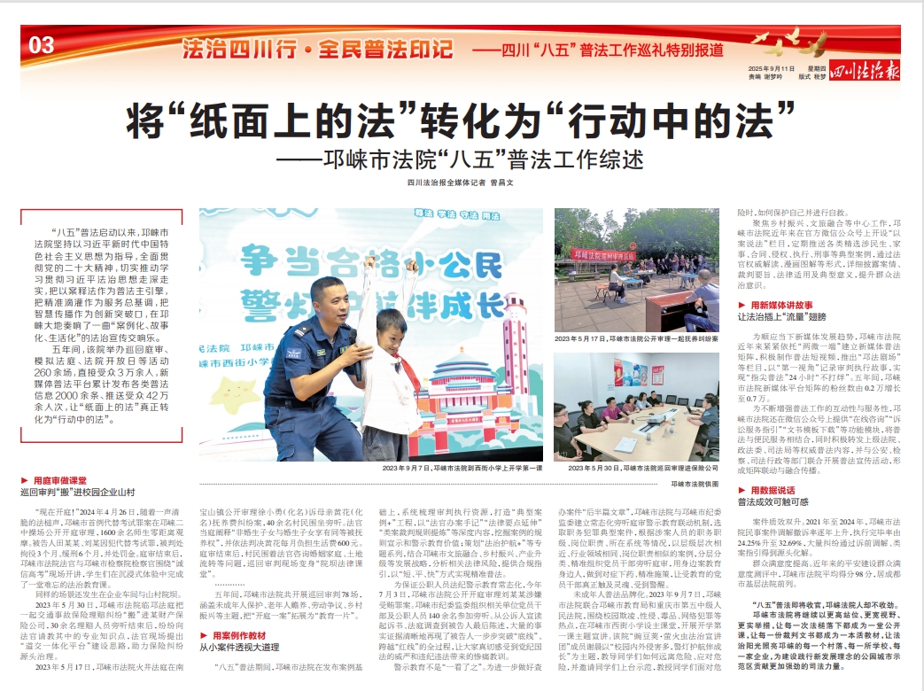 “八五”普法启动以来,邛崃市法院坚持以习近平新时代中国特色社会主义思想为指导,全面贯彻党的二十大精神,切实推动学习贯彻习近平法治思想走深走实,把以案释法作为普法主引擎,把精准滴灌作为服务总基调,把智慧传播作为创新突破口,在邛崃大地奏响了一曲“案例化、故事化、生活化”的法治宣传交响乐。
