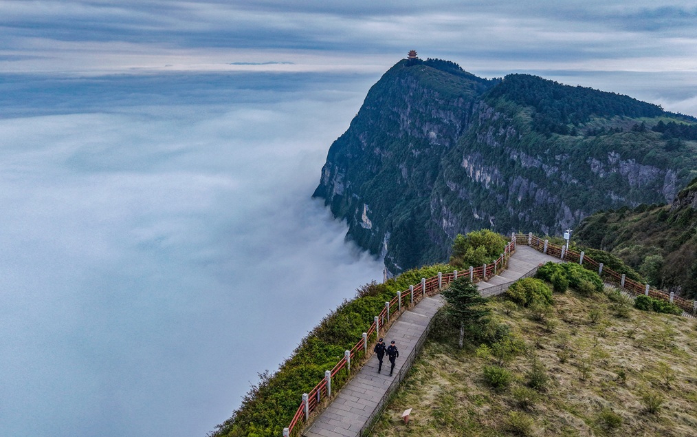 “夜巡执勤队”在通往金顶的最后一段山路上巡逻