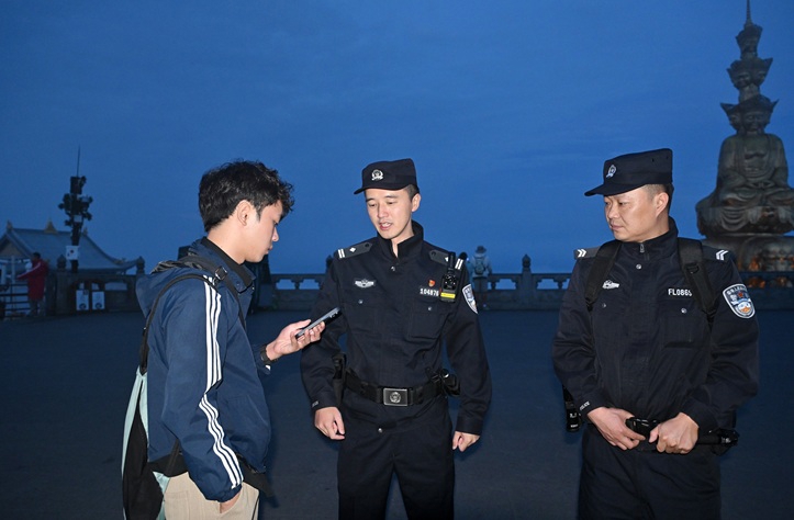 当城市灯火渐隐于云海之下,从山脚到海拔3079米的峨眉之巅,一个个“孤峰警务室”的灯光就会为夜爬峨眉山的游客亮起,“夜巡执勤队”也立即出动。